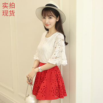 實拍2016女裝時尚甜美淑女顯瘦蓬蓬裙蕾絲兩件套連衣裙套裝 /