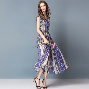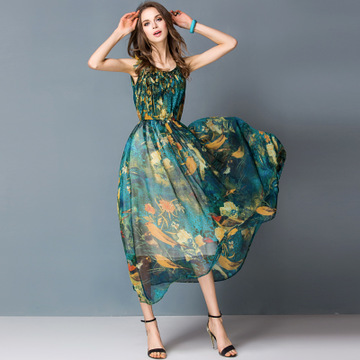 2016夏裝新款高端仿真絲雪紡印花長款連衣裙沙灘裙無袖背心長裙女 /
