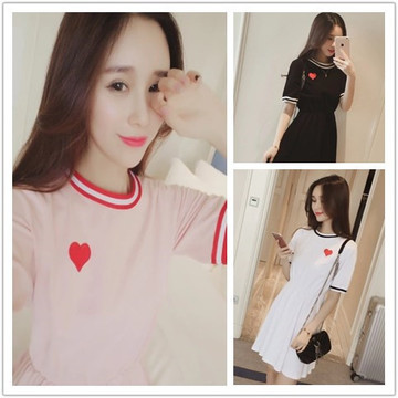韓版學院風甜美愛心刺繡短袖收腰A字連衣裙 /