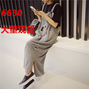 背帶裙長裙中長款大碼加長春裝新款女裝2016寬松破洞連衣裙女打底 /