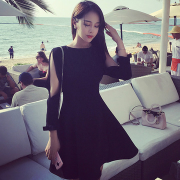 2016春夏新款韓版顯瘦性感露背赫本小黑裙中長款小清新露肩連衣裙 /