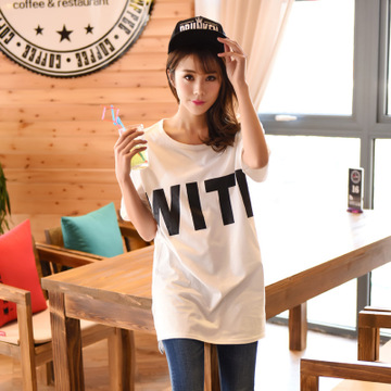 2016年夏季女裝韓版純棉印花字母中長款T恤大碼百搭打底衫女 /