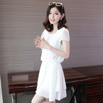 2016夏裝新款連衣裙韓版大碼女裝修身顯瘦純色短袖雪紡裙打底裙 /