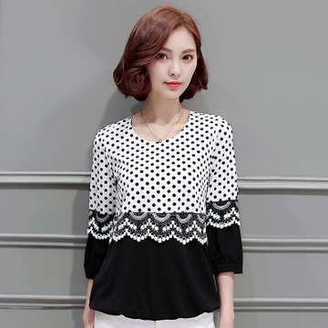 實拍A新款韓版寬松圓點打底衫女五分袖波點小衫雪紡衫上衣短款 /