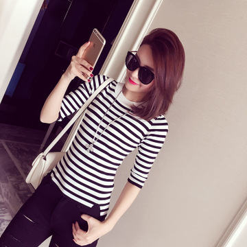 220#2016春裝新款設計感修身彈力半袖套頭針織衫女上衣 /