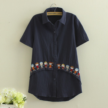2016夏季新款女裝上衣日系森女系百搭小人刺繡寬松棉麻短袖襯衫女 /