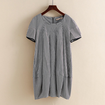熙蘭雅專柜原單尾貨2016夏新款女式寬松不規則短袖條紋燈籠連衣裙 /