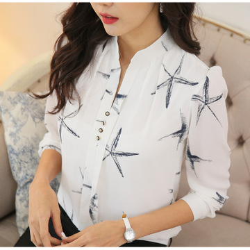 2016春裝新款女裝雪紡衫 海星印花V領襯衫春秋長袖打底衫早春上衣 /