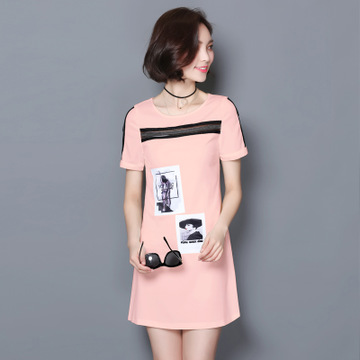 實拍連衣裙女短袖2016夏裝新款韓版修身貼布印花百搭A字裙潮 /