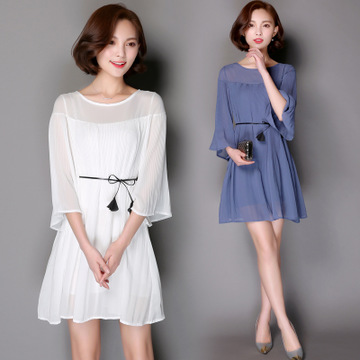 實拍雪紡連衣裙女夏季新款韓版a字短裙九分喇叭袖高腰裙子 /