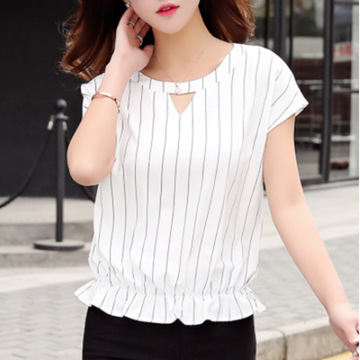 2016年夏季新款時(shí)尚韓范女裝大碼條紋修身顯瘦短袖雪紡襯衫女 /