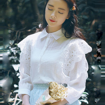 2016夏季日系小清新白色棉麻女士襯衫蕾絲衫襯衣配打底衫兩件套 /