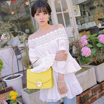 韓國韓版棉麻女裝中長款甜美仙女鏤空蕾絲衫荷葉邊夏裝喇叭袖上衣 /
