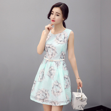2016夏季韓版新款女裝圓領印花修身無袖連衣裙配腰帶 /
