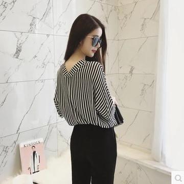 H新款韓版女裝V領豎條波點打底衫中袖雪紡衫寬松大碼襯衫女潮 /