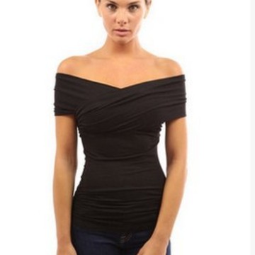 2016歐美熱賣露肩交叉肩褶皺露背修身性感T恤 /