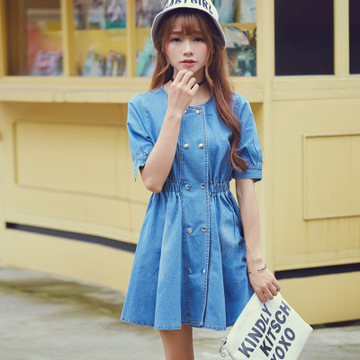 實拍2016夏裝新款修身顯瘦收腰連衣裙學院風牛仔減齡A字裙女 /