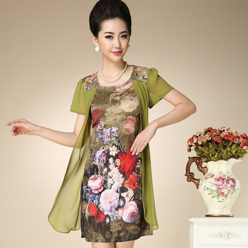 實拍2016夏季中老年加大碼媽媽裝假兩件印花連衣裙女 /