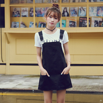 實拍2016夏學生牛仔背帶裙女韓版顯瘦吊帶連衣裙寬松百搭半身裙 /