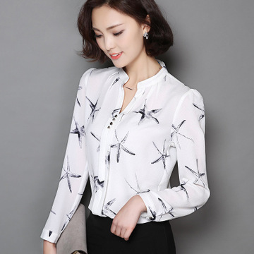 實拍2016春秋季新品印花雪紡衫 韓版修身百搭襯衣女長袖上衣 /