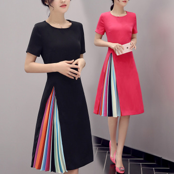 2016春夏新款韓版中長款修身復古印花拼接短袖蓬蓬連衣裙 /