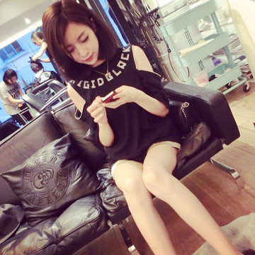 3M反光粉字母!潮牌明星同款 雙拉鏈露肩中長款 短袖T恤 大碼 女 /