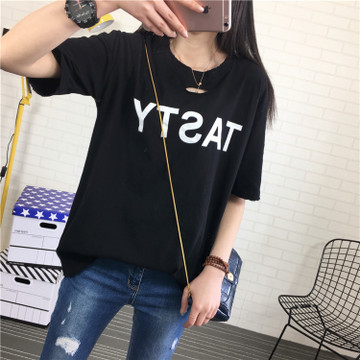 韓國2016夏季新款 領口撕破缺口字母做舊印花短袖T恤女寬松上衣女 /
