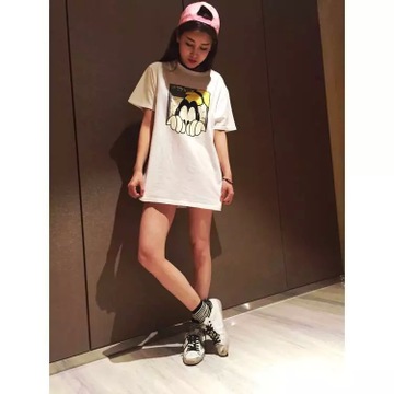16夏款 韓版 水洗棉中長款寬松圓領前后印花卡通圖案T恤短袖 女 /