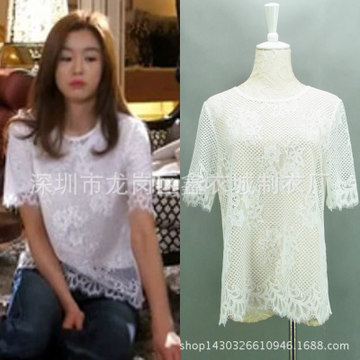 歐美潮牌新款 全智賢千頌伊同款睫毛蕾絲雪紡短袖上衣鏤空衫 /
