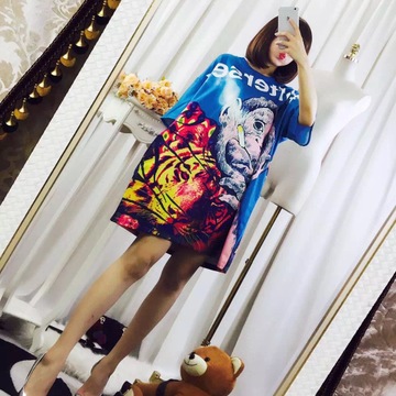 2016歐洲站時尚潮流大牌涂鴉滿印圓領短袖連衣裙大碼休閑女裝 /