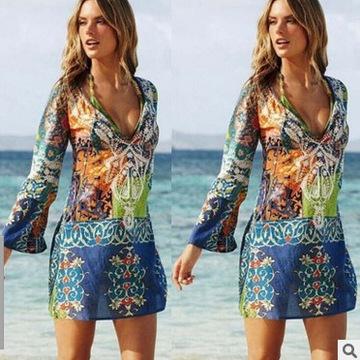 速賣通熱賣新款夏季性感v領(lǐng)雪紡印花長(zhǎng)袖沙灘短裙女 /