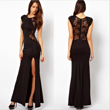 歐美外貿長裙修身顯瘦性感鏤空開叉連衣裙背后蕾絲裙夜店禮 /