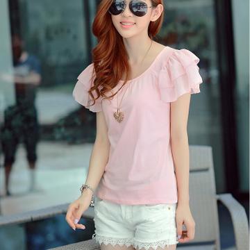 新款甜美女裝短袖T恤女夏裝雪紡袖拼接小衫純棉T恤女式上衣 /