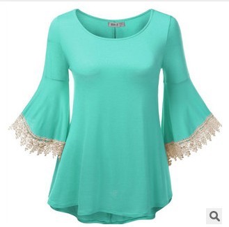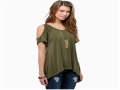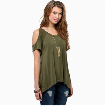 ebay速賣通熱賣新款夏季短袖露肩V領(lǐng)純色棉質(zhì)魚尾下擺女T恤 /