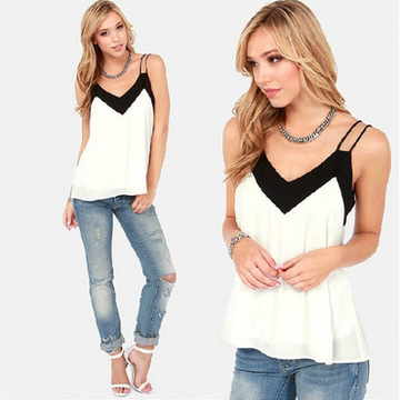 歐美性感黑白拼色V領(lǐng)雙層雪紡露背顯瘦吊帶 /