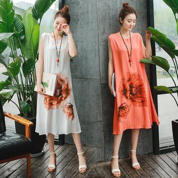 實拍2016夏新款棉麻連衣裙寬松文藝小清新印花大碼中長裙女裝 /