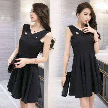 實拍2016新款夏季歐美黑色顯瘦露背吊帶交叉小黑裙優(yōu)雅連衣裙女 /