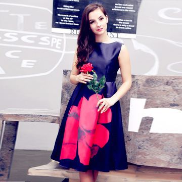 2016夏季新款女大花棉連衣裙歐美風中長款無袖大碼A字 /