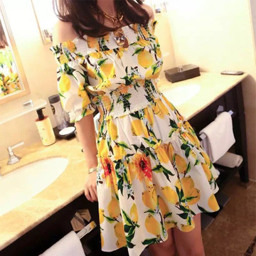 2016歐美春夏新款 露肩一字領碎花中長款高腰連衣裙 /