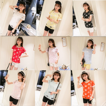 春夏裝新款韓版時(shí)尚性感鏤空五角星星網(wǎng)紗拼接寬松短袖T恤女 /