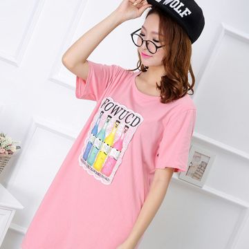 實(shí)拍夏季中長(zhǎng)款短袖圓領(lǐng)寬松大碼女裝印酒瓶繡花拼T恤連衣裙S /