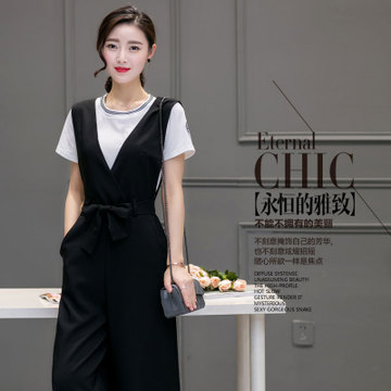 模特實(shí)拍2016新款套裝女闊腿褲連體褲背帶褲+T恤套裝女 /