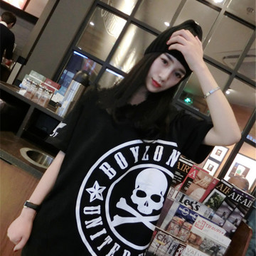 潮牌夏新款BOY字母骷髏頭短袖T恤女中長款寬松顯瘦 /