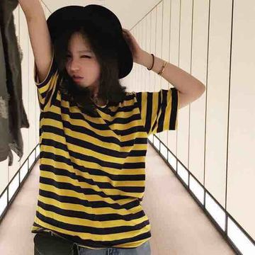 周揚青同款黃黑條紋純棉女短袖百搭黃黑色小蜜蜂T恤 /