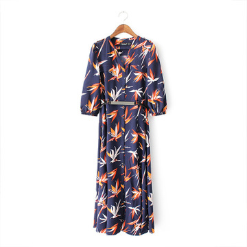 2016春夏新款高品質印花底擺開叉修身款高腰顯瘦V領連衣裙長裙女 /