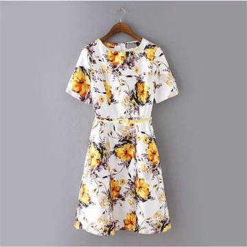 2016春夏新款高腰A字擺花朵圖案印花圓領短袖連衣裙女含腰帶 /