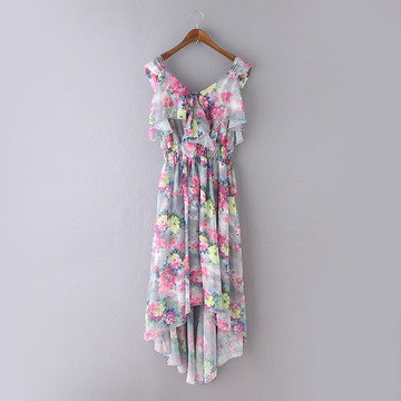 2016春夏新款波西米亞風中長款顯瘦花朵印花燕尾下擺雪紡連衣裙女 /