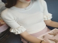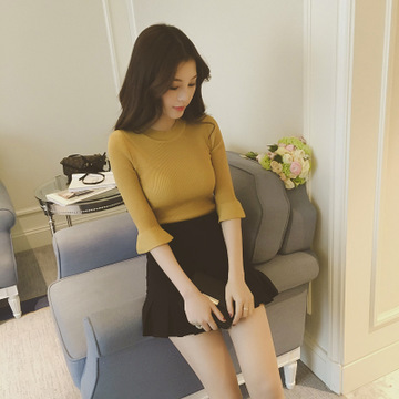 2016春裝韓國新款純色圓領(lǐng)荷葉邊七分袖打底針織衫女 /