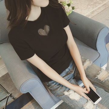 2016春夏新款韓范顯瘦愛心網(wǎng)紗體恤女上衣圓領(lǐng)純棉修身短袖t恤女 /