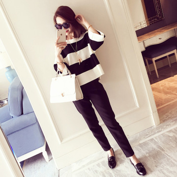 韓版學(xué)院風(fēng)粗條紋套頭針織衫上衣 百搭寬松針織T恤女春裝新款 /